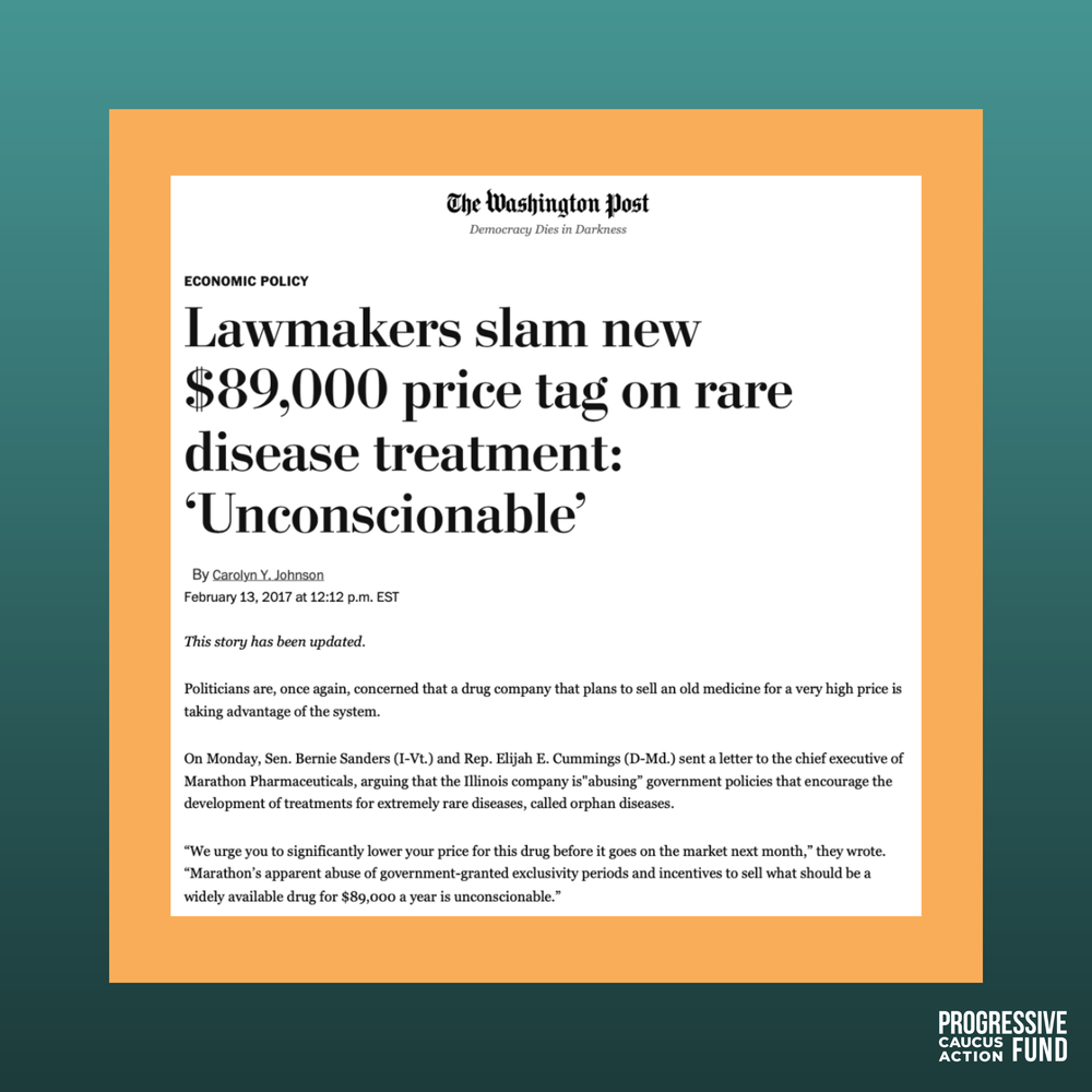 In the example below, Senator Bernie Sanders (I-VT) and the late Congressman Elijah E. Cummings (D-MD) penned a letter to a drug company CEO highlighting skyrocketing drug prices. Letters like this—and the subsequent news coverage—helped grow the salience of this issue over time and built public support for legislation to lower drug prices, like the Inflation Reduction Act (P.L. 117-169). This law allowed Medicare to negotiate with pharmaceutical companies to bring down drug prices for the first time in the program’s history.