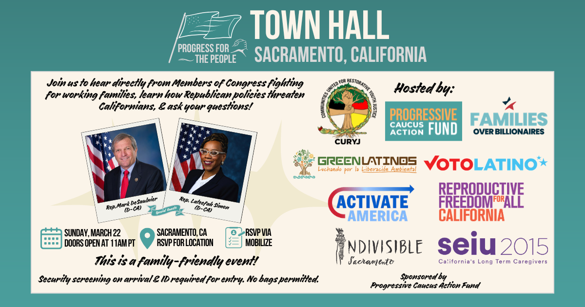 On Friday, March 20, the Progressive Caucus Action Fund and local partners are bringing the Progress for the People Town Hall tour to Phoenix, AZ! Then on Sunday, March 22, we’re stopping in Sacramento, CA!