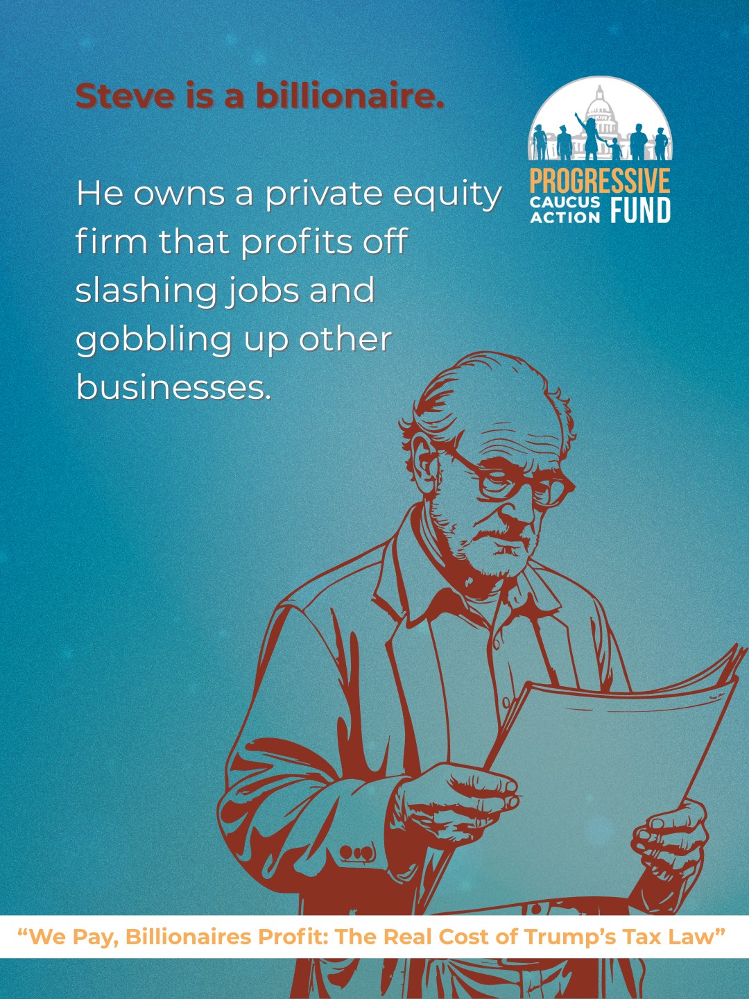 Steve’s business, which generates profits through investment activity, will benefit from reduced tax liability year after year while working people keep paying fixed tax rates on their wages. In order to pay for corporate tax giveaways, the Republican budget law slashed healthcare, food aid, and more.